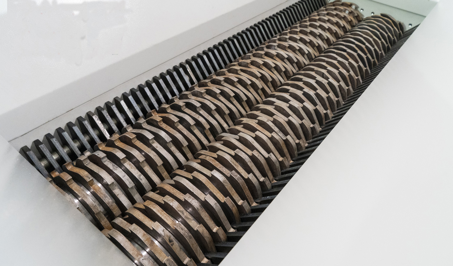 Шредеры работают по принципу разрыва и резания сырья. Сырье поступает в камеру дробления. В камере установлены два шестигранных фрезерованных вала. На валах установлены ножи специальной формы и твердости. Сами ножи имеют ТВЧ или объемную закалку что позволяет им иметь заявленную твердость 58HRC (Hardox 600), либо 40HRC (Сталь 45). С помощью мощных цилиндрических мотор-редукторов ножи проводятся в действие и разрывают (режут) сырье в камере дробления. Скорость валов регулируется электронных блоком и позволяет настраивать производительность, а также крутящий момент под заказчика. Завод располагает 6 видами ножей, что позволяет разрывать или резать практически любой материал. С помощью противорежущих пластин, установленных по бокам камеры, материал не наворачивается на валы и полностью измельчается.